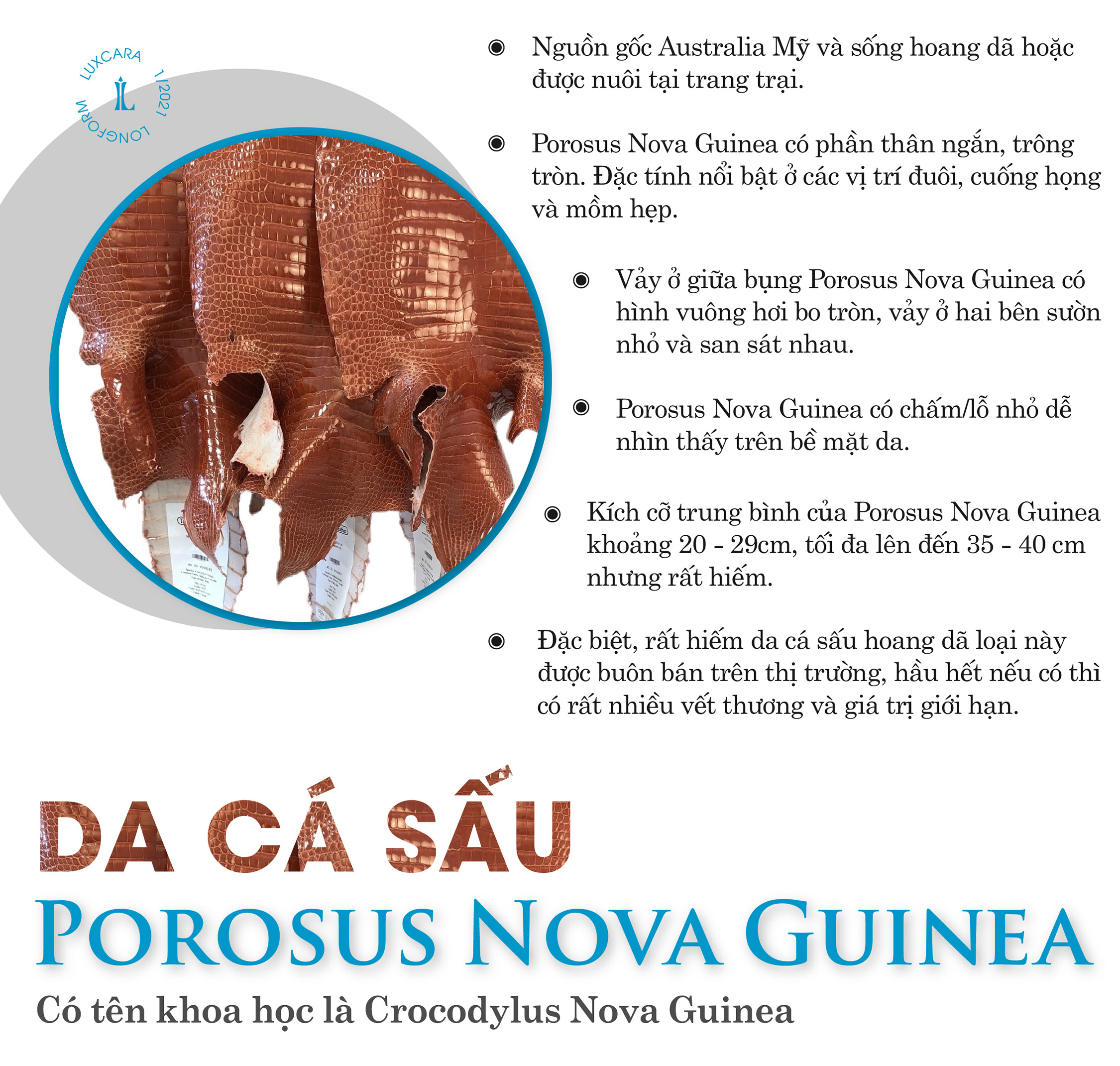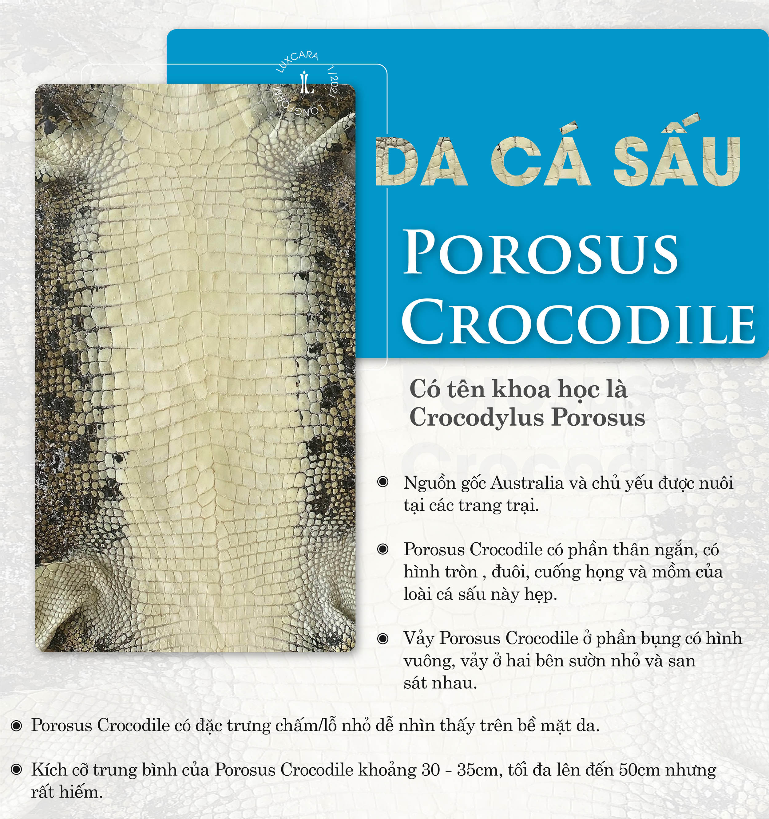 Theo khảo sát của giới thời trang, hiện nay trên thị trường giao dịch da cá sấu có 4 loại phổ biến gồm American Alligator, Nile Crocodile, Porosus Crocodile, Nova Guinea Crocodile.