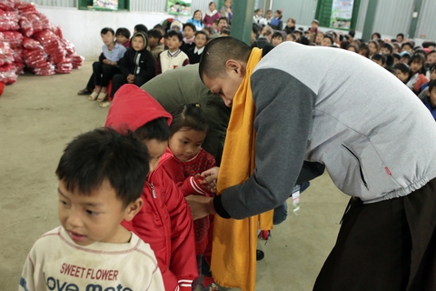 Đại Đức Thích Minh Tâm mặc áo ấm cho các em nhỏ học sinh vùng cao.