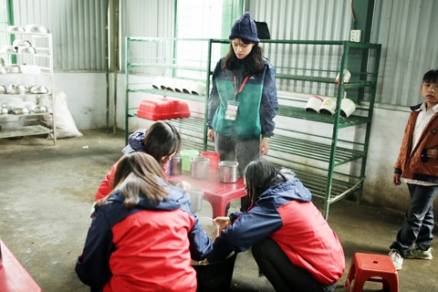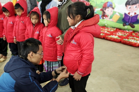 Anh Khả Anh mặc áo ấm cho các em nhỏ học sinh vùng cao.