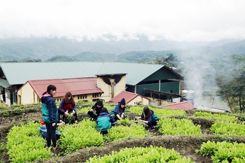 Các thành viên đoàn từ thiện đi hái rau để nấu bữa cơm dinh dưỡng dành cho các em học sinh.