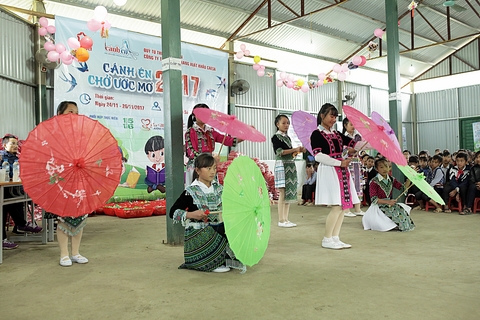 Các em học sinh biểu diễn tiết mục văn nghệ bằng bản sắc dân tộc vùng cao.