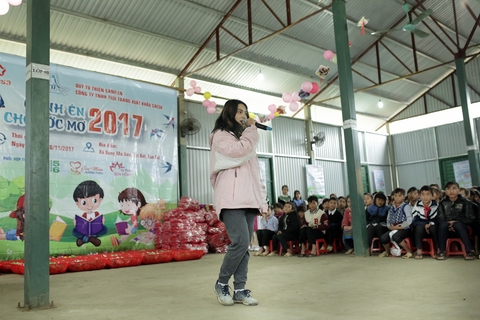 Ca sỹ Hiền Mai - Á quân The Voice 2017 thay mặt đoàn từ thiện hát tặng thầy cô và các em học sinh.