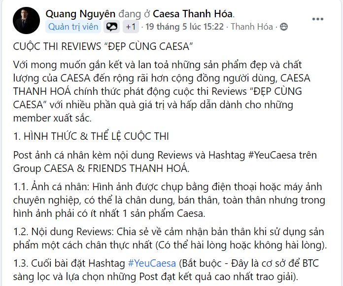 Để tham gia cuộc thi các member (thành viên) trong group sẽ post ảnh cá nhân kèm nội dung reviews và Hashtag #YeuCaesa trên group Caesa & Friends Thanh Hóa.